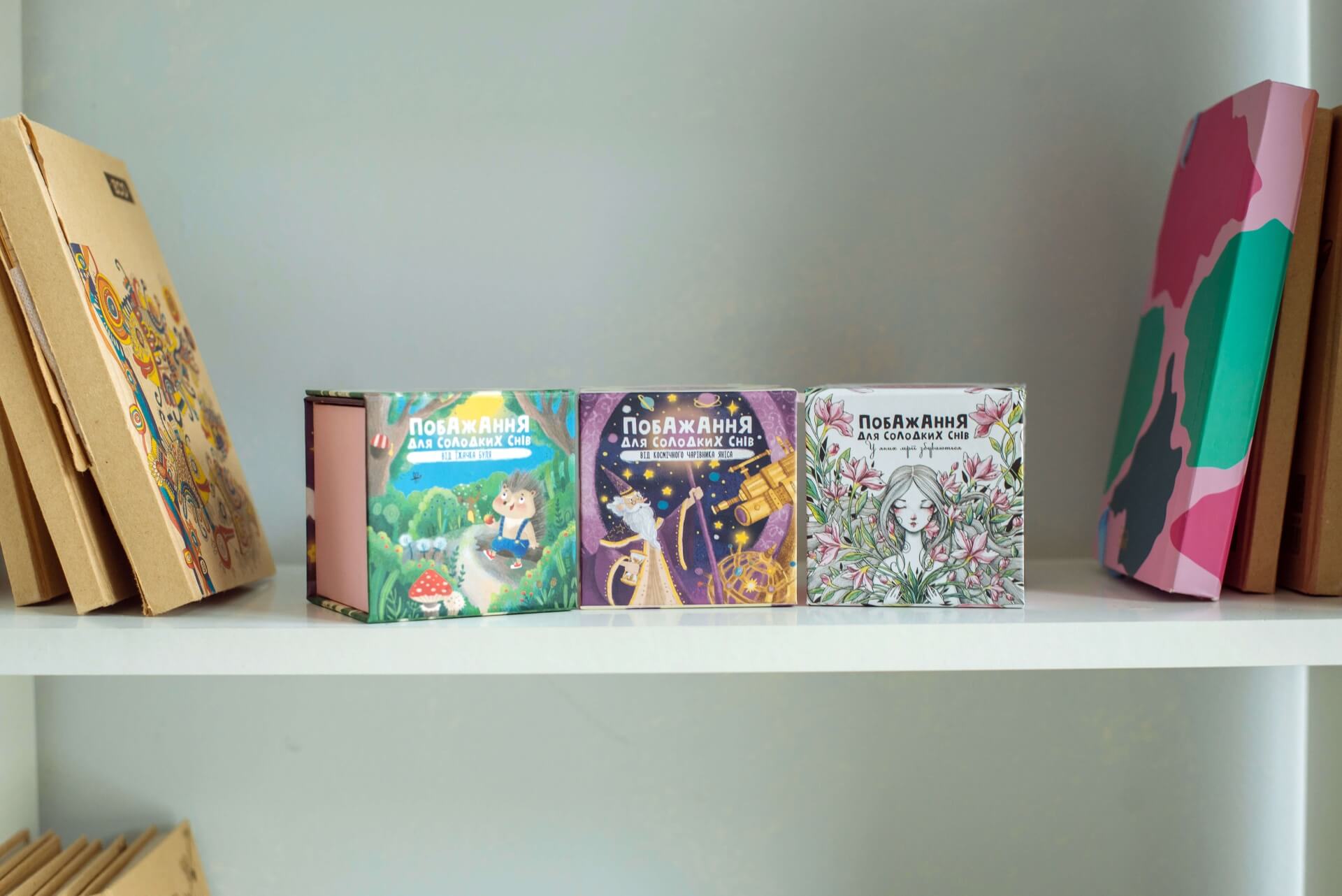 Коробочка виглядає, як лотерея, ніколи не знаєш, що саме витягнеш сьогодні. Можливо, Їжачок Буль побажає дитині побачити пінгвіна та врятувати його від глобального потепління. Дитина відчує себе героєм. А можливо Чарівник Яніс побажає побачити себе уві сні кухарем, що готує дуже смачне печиво, отримуючи у нагороду оплески. Мандрівки, цілющі овочі та фрукти, веселі пригоди, щедрість, сила волі, цілеспрямованість, креативність, космос — все це є в наших коробочках. Тому хочеться знову витягнути побажання.